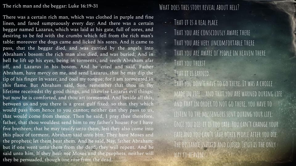 • Once you die: it is too late. You can’t change your fate and you can’t save other people after you die. The distance is fixed and closed. Jesus is the only way to heaven.